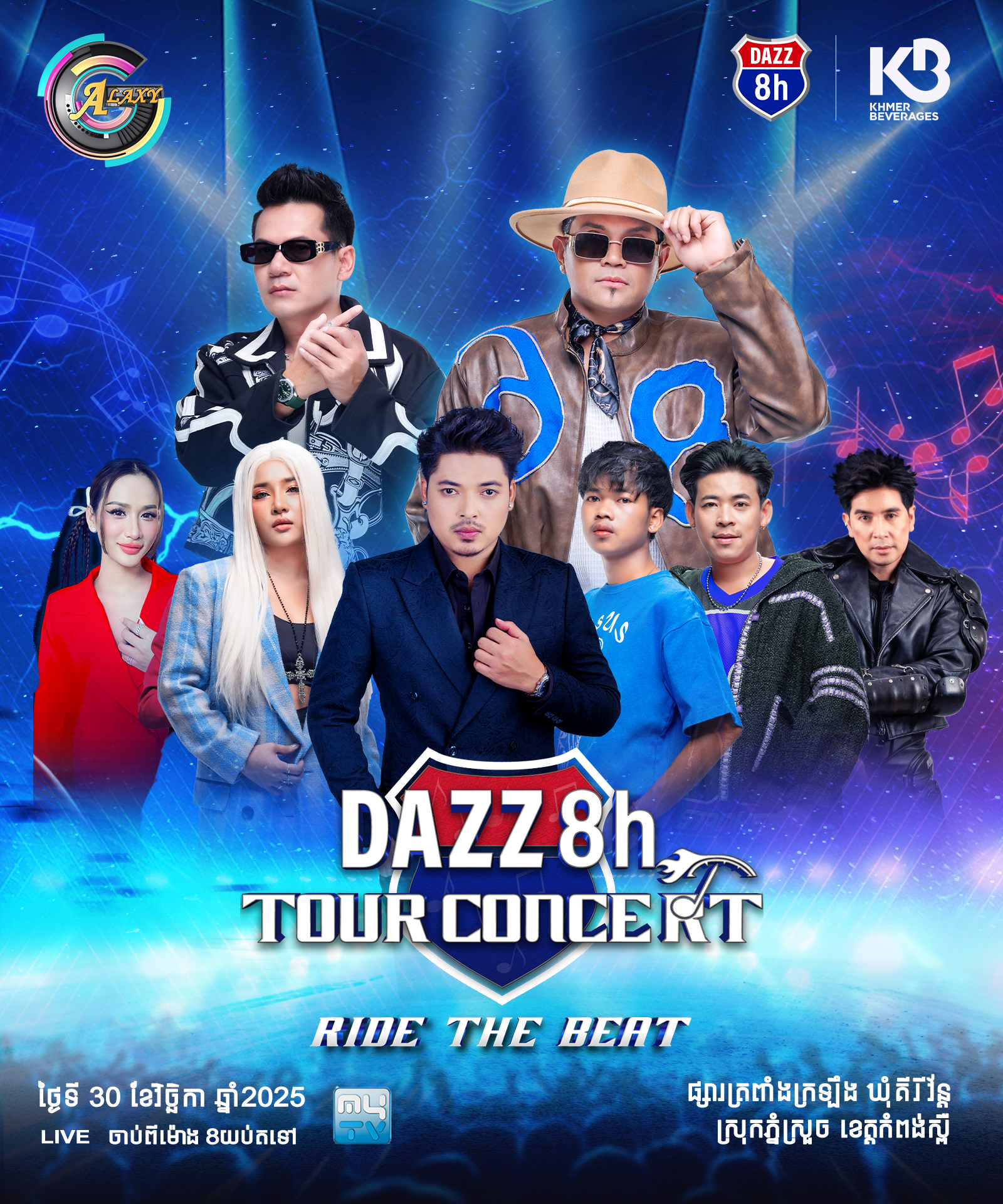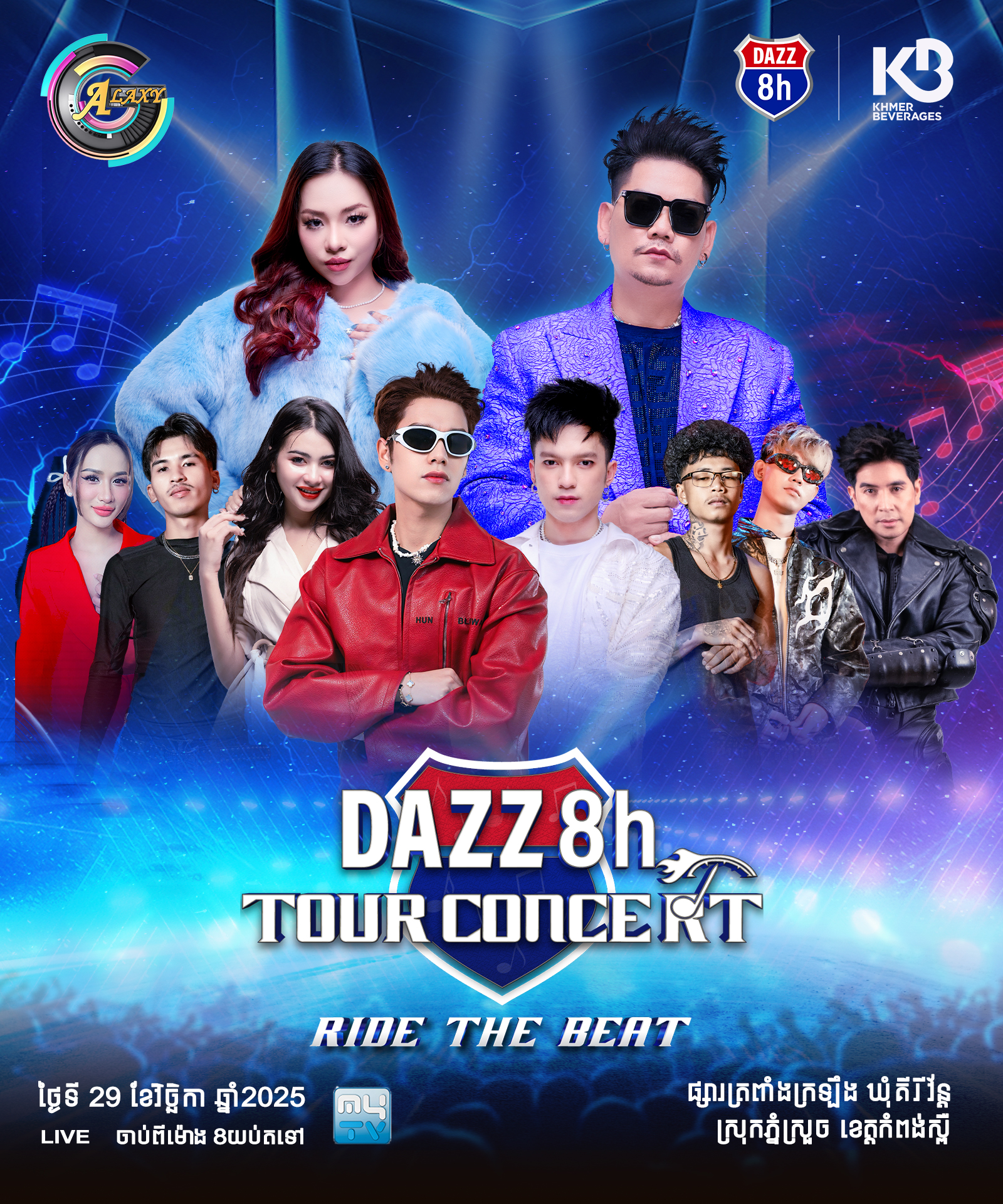 នៅថ្ងៃទី២៩-៣០ ខែវិច្ឆិកា ឆ្នាំ២០២៥នេះ មហាព្រឹត្តិការណ៍ប្រគំតន្រ្តីខ្នាតយក្ស DAZZ TOUR CONCERT RIDE THE BEAT នឹងរៀបចំឡើងនៅលើទឹកដីខេត្តកំពង់ស្ពឺ នៅក្បែរផ្សារត្រពាំងក្រឡឹង ឃុំគរីវ័ន្ត ស្រុកភ្នំស្រួច ចាប់ពីម៉ោង៨យប់តទៅ។ ទស្សនិកជនអាចចូលរួមទស្សនារាំលេងកម្សាន្តបានដោយសេរី ដោយជួបជាមួយកំពូលតារាចម្រៀងល្បីៗប្រចាំនៅក្នុងផលិតកម្ម ហ្គាឡាក់ស៊ី ណាវ៉ាត្រា ដូចជាកំពូលតារាចម្រៀង ព្រាប សុវត្ថិ , កញ្ញា តន់ ចន្ទសីម៉ា ,លោក សុវត្ថិ មុនីវណ្ណ , លោក សុវត្ថិ សិរីវុឌ្ឍ និង បេក្ខជនកម្មវិធីប្រឡងចម្រង CAMBO RAPPER ជាដើម… ដោយឡែកនៅថ្ងៃទី ៣០ ខែ វិច្ឆិកា ទស្សនិកជននឹងជួបជាមួយតារាចម្រៀង ឧកញ៉ា ខេមរៈ សិរីមន្ត , ខាន់ ជេមស៌ , គូម៉ា និង កញ្ញា លីនដា , លោក រាជ ប្រាថ្នា និងលោក Nak Fake ។
