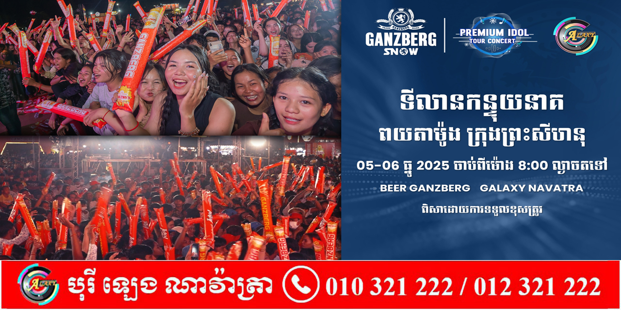 តស់! ជួបគ្នារាំលេងកម្សាន្ត ស្រែកហ៊ោកញ្ជៀវតាមចង្វាក់ភ្លេង ក្រេបរសជាតិស្រាបៀរ GANZBERG ឈ្ងុយឆ្ងាញ់កម្រិតពិភពលោកនៅទីលានកន្ទុយនាគ ពយតាមូង ក្រុងព្រះសីហនុ ខេត្តព្រះសីហនុ រយៈពេល២ថ្ងៃចាប់ពីថ្ងៃទី៥-៦ ខែធ្នូ ឆ្នាំ២០២៥។