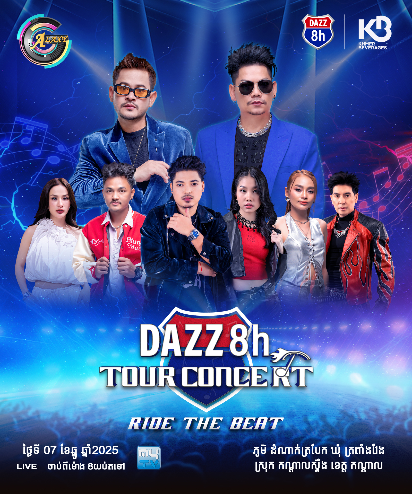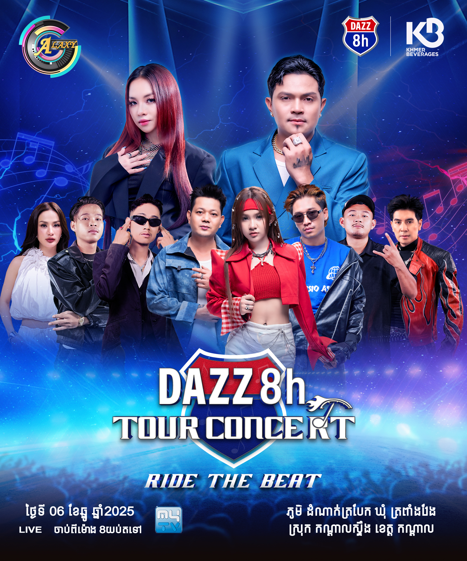 នៅថ្ងៃទី06-07 ខែធ្នូ ឆ្នាំ2025 នេះ មហាព្រឹត្តិការណ៍ប្រគំតន្រ្តីខ្នាតយក្ស DAZZ TOUR CONCERT RIDE THE BEAT នឹងរៀបចំឡើងនៅលើទឹកដីស្រុកណ្តាលស្ទឹង ខេត្តកណ្តាល បណ្តោយផ្លូវជាតិលេខ៣ ចាប់ពីម៉ោង៨យប់តទៅ។ ទស្សនិកជនអាចចូលរួមទស្សនារាំលេងកម្សាន្តបានដោយសេរី ដោយជួបជាមួយកំពូលតារាចម្រៀងល្បីៗប្រចាំនៅក្នុងផលិតកម្ម ហ្គាឡាក់ស៊ី ណាវ៉ាត្រា នៅថ្ងៃទី06 ខែធ្នូ ជួបកំពូលតារាចម្រៀង ឧកញ៉ា ខេមរៈ សិរីមន្ត , កញ្ញា តន់ ចន្ទសីម៉ា ,កញ្ញា សុខុម រចនា ,លោក VIKIT ,លោក រ៉ុន គឹមសន និង បេក្ខជនកម្មវិធីប្រឡងចម្រៀង CAMBO RAPPER ដោយឡែកនៅថ្ងៃទី07 ខែធ្នូ ទស្សនិកជននឹងជួបជាមួយកំពូលតារាចម្រៀង លោក ព្រាប សុវត្ថិ , លោក ខេម , លោក គូម៉ា ,កញ្ញា អ៊ុក សុវណ្ណារី ,លោក ពូ និង កញ្ញា ឡុង លក្ខិណា។