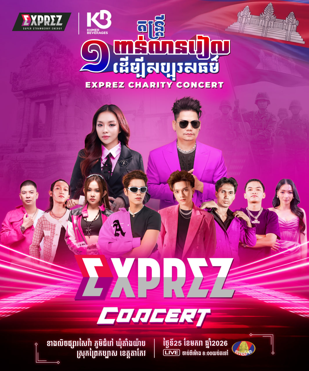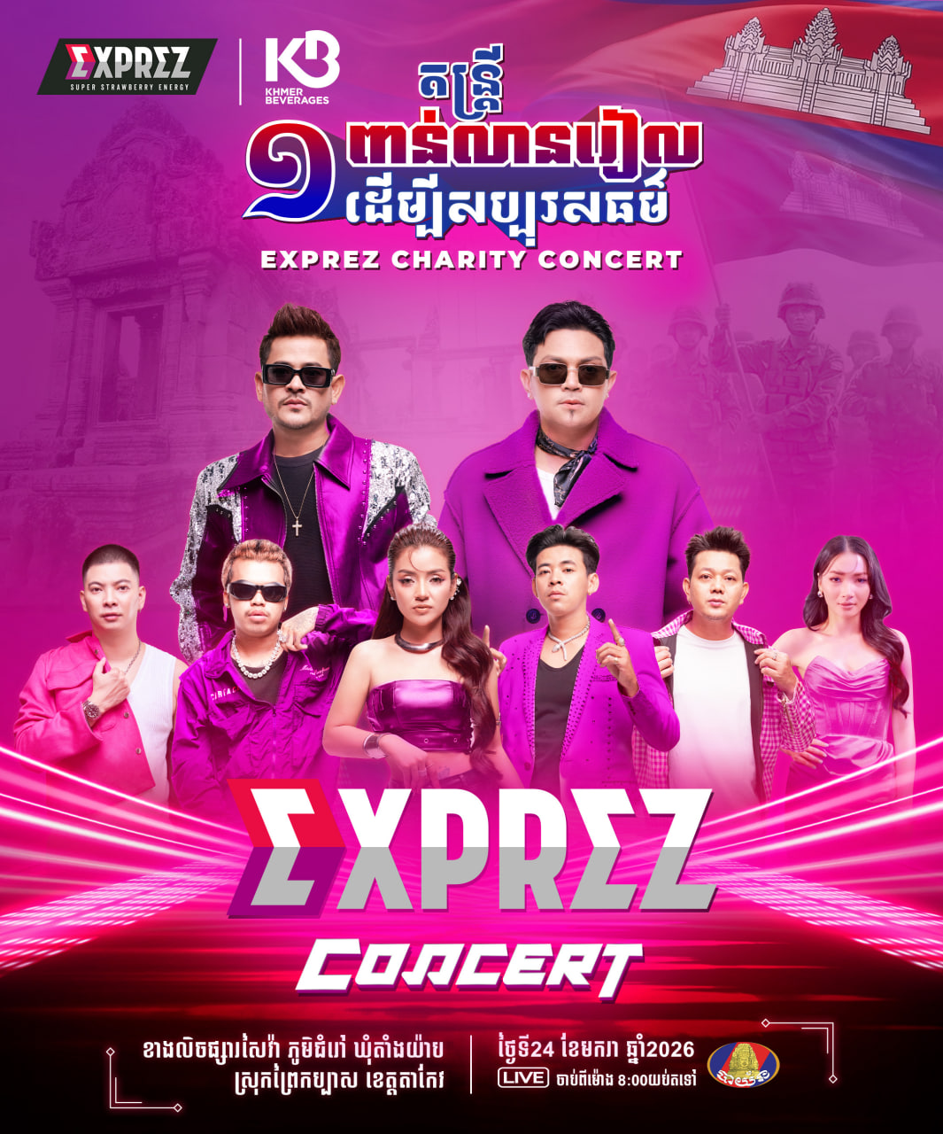 សម្រាប់ព្រឹត្តិការណ៍ប្រគំតន្រ្តីសប្បុរសធម៌ EXPREZ CHARITY CONCERT ដែលនឹងរៀបចំឡើងនៅចុងសប្តាហ៍នេះ មានរយៈពេល២ថ្ងៃជាប់ៗគ្នា ដែលស្ថិតនៅខាងលិចផ្សារសៃវ៉ា ភូមិជំរៅ ឃុំតាំងយ៉ាប ស្រុកព្រៃកប្បាស ខេត្តតាកែវ ។ សម្រាប់ថ្ងៃទី ២៤ ខែ មករា ឆ្នាំ ២០២៦ ជួបជាមួយកំពូលតារាចម្រៀងខេមរៈ សិរីមន្ត ,លោក ខេម , អ្នកនាង ខាត់ សួស្តី និងតារាចម្រៀងជាច្រើនរូបទៀត ។ អ្វីដែលកាន់តែពិសេសលើសពីនេះទៅទៀត នៅថ្ងៃទី ២៥ ខែ មករា ឆ្នាំ ២០២៦ ជួបជាមួយកំពូលតារាចម្រៀង ព្រាប សុវត្ថិ ,កញ្ញា តន់ ចន្ទសីម៉ា និងកូនប្រុសទាំងពីររបស់កំពូលតារាចម្រៀង ព្រាប សុវត្ថិ រួមជាមួយតារាចម្រៀងវ័យក្មេងជាច្រើនរូបទៀត ។