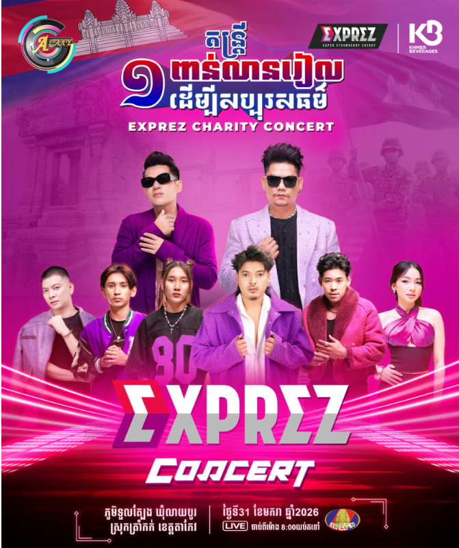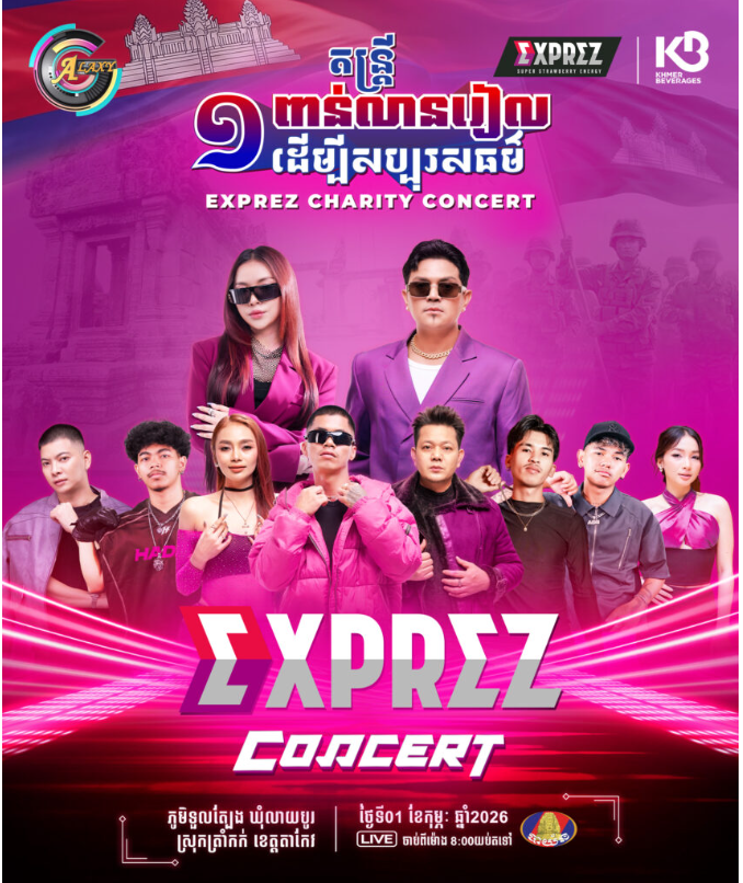 ឆ្លើយតបទៅតាមការសំណូមពរ EXPREZ CHARITY CONCERT បានចេញពីស្រុក ព្រៃកប្បាល និងបានឈានចូលស្រុក ត្រាំកក់ ជាបន្តទៀតនៅចុងសប្តាហ៍បំណាច់ខែ មករា នេះ ជាក់ស្តែងនៅ ថ្ងៃទី ៣១ ខែ មករា ឆ្នាំ ២០២៦ ជូបជាមួយកំពូលតារាចម្រៀង ព្រាប សុវត្ថិ , ខាន់ ជេមស៌ , គូម៉ា រួមទាំងកូនៗរបស់លោក ខាន់ ជេមស៌ ផងដែរ ។ ដោយឡែកសម្រាប់ថ្ងៃទី០១ ខែ កុម្ភៈ ឆ្នាំ ២០២៦ វិញ ជួបជាមួយកំពូលតារាចម្រៀង ឧកញ៉ា ខេមរៈ សិរីមន្ត , កញ្ញា តន់ ចន្ទសីម៉ា និងតារាចម្រៀងវ័យក្មេងសម្លេងពិរោះជាច្រើនរូបទៀត ។