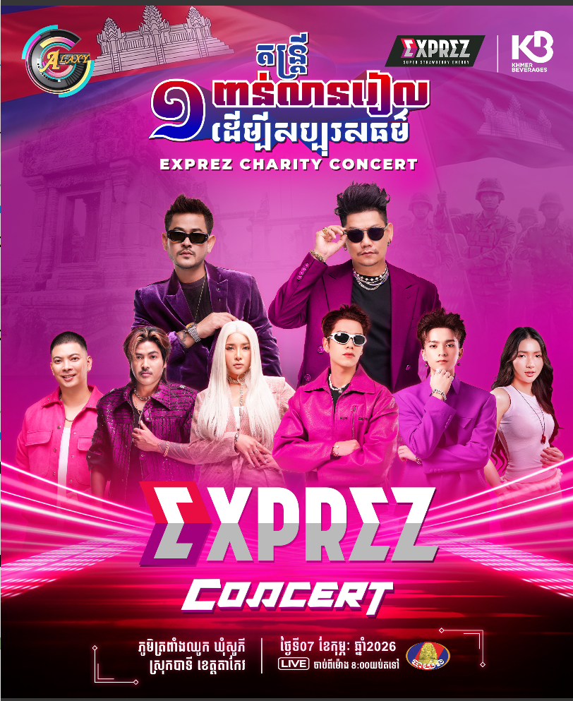 តោះណាត់ជួបគ្នាឱ្យហើយ ! ព្រឹត្តិការណ៍ប្រគំតន្រ្តី EXPREZ CHARITY CONCERT ថែមជូនទស្សនិកតាមសំណូមពរ និងចូលរួមទស្សនាដោយសេរី ។ ថវិកាដែលទទួលបាននៅក្នុងការប្រគំតន្រ្តី Exprez Charity Concert នឹងទុកសម្រាប់ជួយដល់ការងារសង្គម ។ តន្រ្តី១ពាន់លានរៀលដើម្បីសប្បុរសធម៌ ស្មារតីរួបរួម ខ្មែរស្រឡាញ់ខ្មែរ ! Exprez Charity Concert សម្លេងខ្មែររួបរួម ក្នុងឆន្ទៈខ្មែរតែមួយ ៕