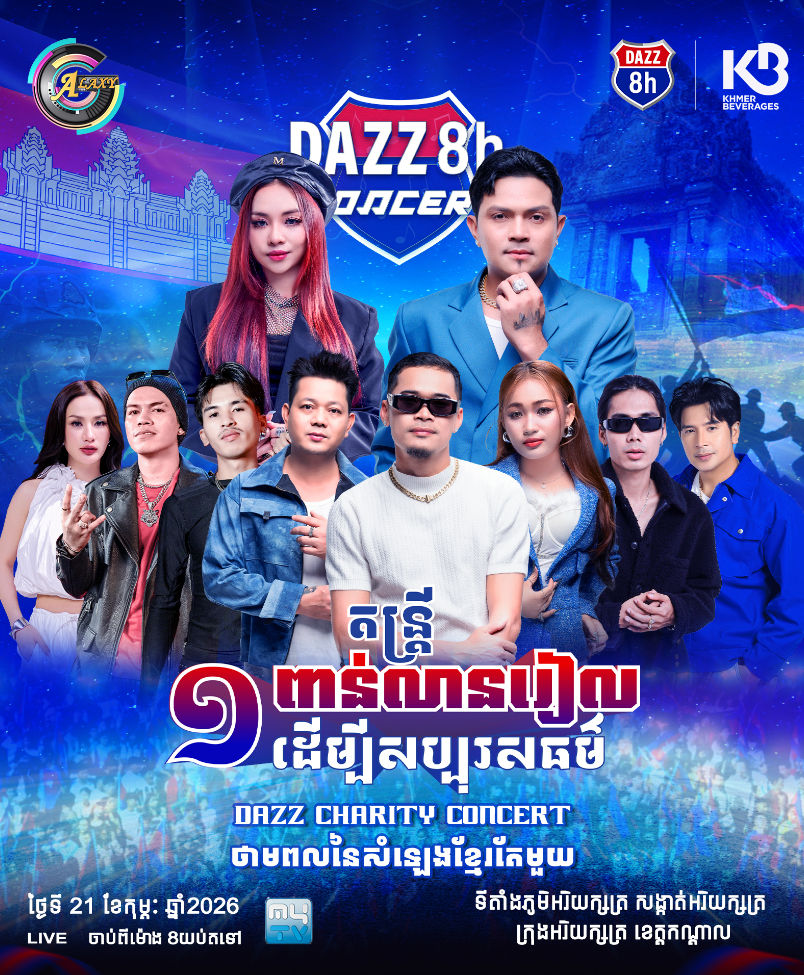 កំពូលតារាចម្រៀងជាច្រើនរូបត្រៀមនឹងទៅអង្រួនឆាក  DAZZ CHARITY CONCERT ឱ្យផ្ទុះកក្រើកឡើងតែម្តងមុនដាច់ខែកុម្ភះនេះ ជាក់ស្តែងនៅថ្ងៃទី ២១ ខែ កុម្ភៈ ឆ្នាំ ២០២៦ ជួបជាមួយកំពូលតារាចម្រៀង ឧកញ៉ា ខេមរៈ សិរីមន្ត , កញ្ញា តន់ ចន្ទសីម៉ា ព្រមទាំងតារាចម្រៀងវ័យក្មេងសម្លេងពិរោះជាច្រើនរូបទៀត ។ ដោយឡែកនៅថ្ងៃទី២២ ខែកុម្ភៈ ឆ្នាំ២០២៦ ជួបជាមួយកំពូលតារាចម្រៀង លោក ព្រាប សុវត្ថិ , លោកខេម , លោក សុវត្ថិ មុនីវណ្ណ និង លោក សុវត្ថិ សិរីវុឌ្ឍ ព្រមទាំងតារាចម្រៀងវ័យក្មេងសម្លេងពីរោះព្រមទាំងមានរូបសម្រស់ស្រស់ស្អាត និងរស់រាយរាក់ទាក់ផងដែរ ។