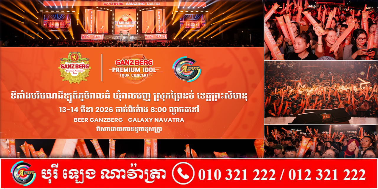 កុំភ្លេចចូលរួមទស្សនាការប្រគំតន្រ្តី GANZBERG PREMIUM IDOL TOUR CONCERTដោយសេរី និងក្រេបរសជាតិស្រាបៀរ GANZBERG ដែលឈ្ងុយឆ្ងាញ់កម្រិតពិភពលោកនៅតំបន់សមុទ្រ បានទាំង Chill បានទាំងទស្សនាការប្រគំតន្រ្តីហ្រ្វី រកឯណាបាន បើមិនណាត់ជួបគ្នាទេ ប្រយ័ត្នស្តាយក្រោយ  ។